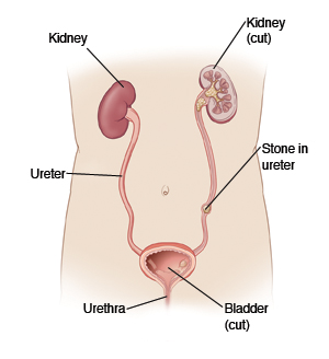 When the stone breaks free and starts to move down the ureter (the narrow tube joining the kidney to the bladder) it often causes sharp, severe back and side pain. Nausea and vomiting also often occur. When the stone reaches the bladder, the pain stops. Once in your bladder, the kidney stone may pass through the urethra (urinary opening) while you are urinating (which may cause pain to start again). Or it may break into such small fragments that you don’t notice it passing.